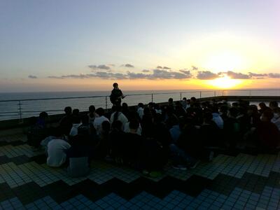 5年生臨海自然教室④2日目 投稿: HP担当 (11/27) 5年生の臨海自然教室も2日目となりました。 2日目は朝早く起床し、日の出とともに朝の集いを行いました。朝食を済ませ、これから海浜オリエンテーリングと塩作り・つぼ焼きいもづくりが待っています。 -